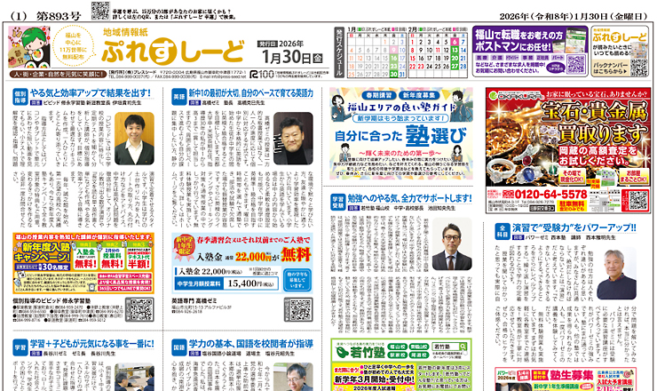 地域情報紙ぷれすしーど1/30号 ーーーーーーーーーーーーー 福山の頼りになる学習塾を取り上げて、各校の特徴や学習法などを教えてもらいました。 福山エリアの良い塾ガイド ーーーーーーーーーーーーー ◇ ゆめフェスタinビッグ・ローズ ◇ うさぎやアイテム通信 ◇ ふくやまへ出かけよう ◇ Human CloseUp 顔 ◇ 日帰りバスツアー 参加者募集中! ◇ ワンプレートレシピ ◇ 親子でチャレンジ まちがいさがし ◇ 異業種リレーの「わ」 ◇ お誕生日おめでとう! ◇ 子育て支援情報 ◇ 不動産一括査定 ◇ 福山求人ポストマン 他 WEBで読む 地域情報紙ぷれすしーど1/23号